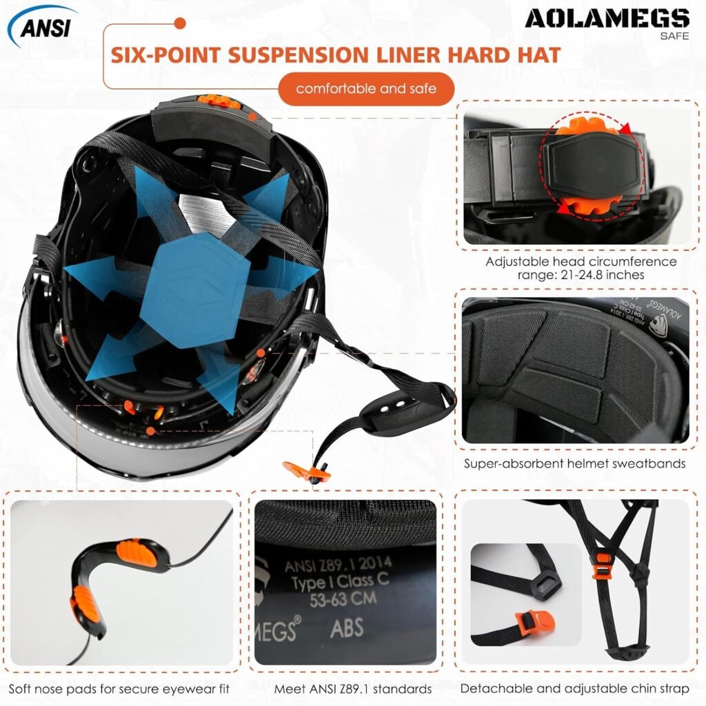 • Six Point Suspension System: Engineered for comfort, the AOLAMEGS hard hats, approved by OSHA for both men and women, boast a Rapid-Dial ratcheting headgear that can be effortlessly adjusted with one hand, eliminating the need to remove the construction hard hat. The 6-point suspension system enhances shock absorption, while the soft cup-style chinstrap offers additional security and stability to the wearer